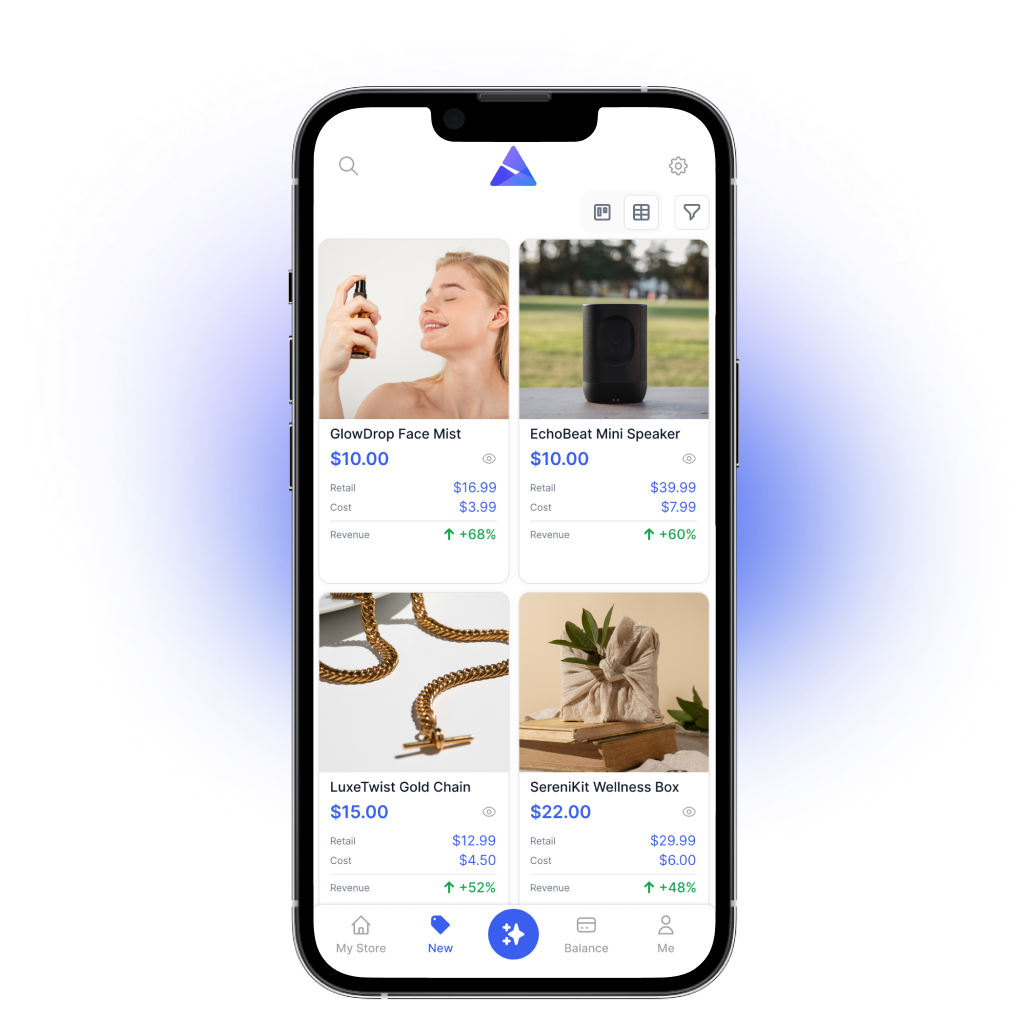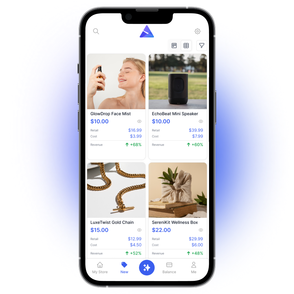 Your Creator Store goes live instantly with 30+ curated, high-margin products tailored to your audience. Customize your name, layout, and start selling.
