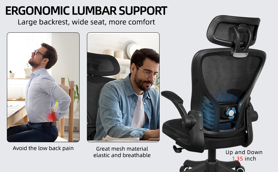 ★ 【Upgraded Material】This home desk office chairs with wheels are built in an impact and durable frame,with five durable nylon casters,allowing users to move in the chair smoothly and stably.Max capacity up to 330lbs.The high back office chair with adjustable lumbar support,giving soft and bouncy support to whole body. All parts are made of breathable mesh to release the body heat and maintain a fine skin temperature.